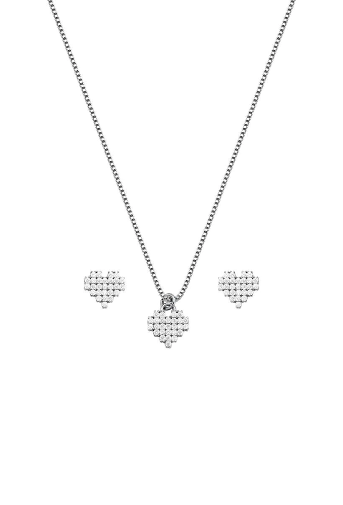 O Conjunto Coração Pixel Cravejado é banhado a Ródio Branco de alta qualidade e traz um design exclusivo: o clássico coração em versão pixelada, totalmente cravejado com microzircônias cristal para um brilho marcante e sofisticado.