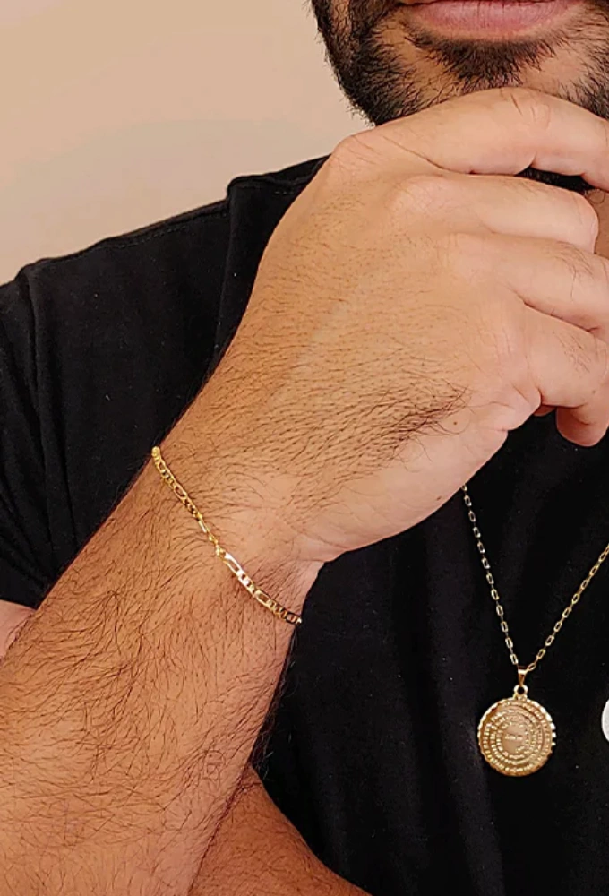 Pulseira masculina com corrente modelo Fígaro, conhecida pelo visual clássico e marcante.